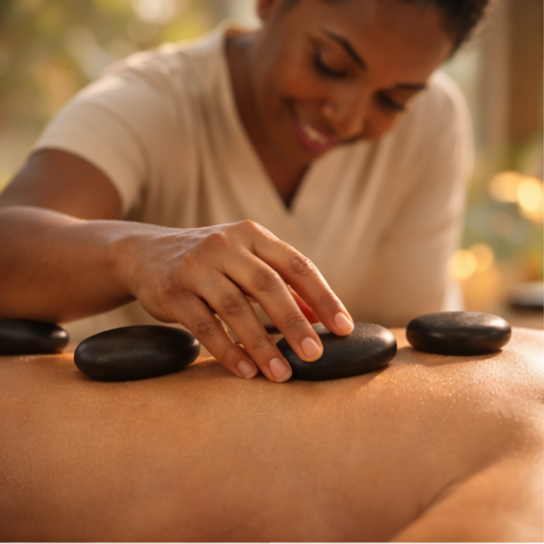 Smooth river stones are gently heated and placed on key energy points, melting away deep tension and restoring your inner calm. The warmth penetrates tight muscles, soothing away pain, stress, and emotional heaviness. This massage is ideal for those seeking balance, quiet, and restoration.